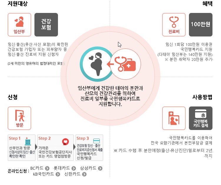 임신바우처란 임신과 출산에 관련된 의료비 부담을 경감하여 출산을 할 수 있는 환경을 조성하고, 건강한 태아를 분만할 수 있도록 임신과 출산에 관련된 진료비의 부담금을 지원해주는 이용권을 이야기 합니다. 바우처란 현금이 아닌 금전적인 가치가 있는 형태의 쿠폰과 같은 것입니다. 현금과는 달리 발행한 기관이 지정한 장소와 지정된 기간 동안에 정해진 금액만큼의 서비스나 재화를 구입하는데 이용할 수 있습니다. 정부에서 지원하는 임신바우처는 국민행복카드를 통해 지급됩니다.