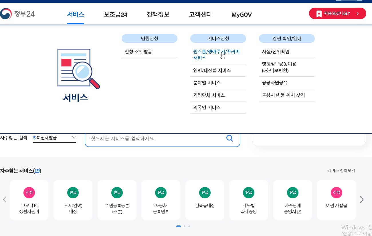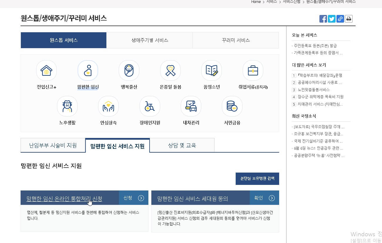 [정부 24 홈페이지 접속 > 서비스 > 원스톱/생애주기/꾸러미서비스 > 맘편한 임신 > 맘편한 임신 온라인 통합처리 신청]