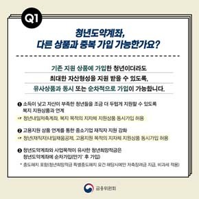 청년도약계좌는 가입 후에 3년간은 고정금리가 적용됩니다. 그리고 이후 2년은 변동금리가 적용될 예정입니다. 또한 연봉 2400만원 이하의 신청자의 경우 일정 수준의 우대금리를 부여합니다. 금리수준은 취급기관(은행)과 확정을 하고 금융협회 홈페이지를 통해서 공시할 예정입니다.