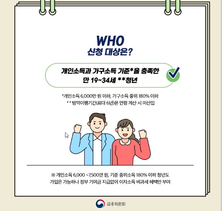 청년도약계좌를 신청하기 전에 자신이 신청대상의 조건에 맞는지 알아보는 것이 중요합니다. 청년도약계좌의 신청대상 조건은 개인소득 6,000만원 이하 그리고 가구 소득 중위 180% 이하에 속하는 만 19세~만 34세의 청년입니다. 2023년 기준으로 2004~1989년생이 가입 가능합니다.병역이행을 했을 경우 최대 6년까지 연령을 제외하고 계산하게 됩니다. 일반적으로 2년의 병역을 이행했다면 만 37세까지 가입이 가능한 겁니다. 예전 희망 적금과 같은 정책 상품에 가입하였더라도 동시에 가입이 가능합니다. 자산이 부족한 청년들을 위한 내일 저축 계좌 등 복지 지원 상품과 동시 가입이 가능합니다. 재직자의 경우 총 급여 6,000만원에서 7,500만원인 경우 정부 기여금 없이 비과세 혜택만 적용됩니다. 공무원도 가입이 가능하지만 소득이 없는 취업 준비생과 대학생은 해당되지 않습니다. 아르바이트의 경우 고용보험에 가입이 되어있다면 신청이 가능합니다. 중도 해지를 할 시에는 정부 기여금이나 비과세 혜택을 받을 수 없습니다. 만약 가입을 한 뒤에 조건 연령을 넘어가더라도 계좌가 유지 됩니다.